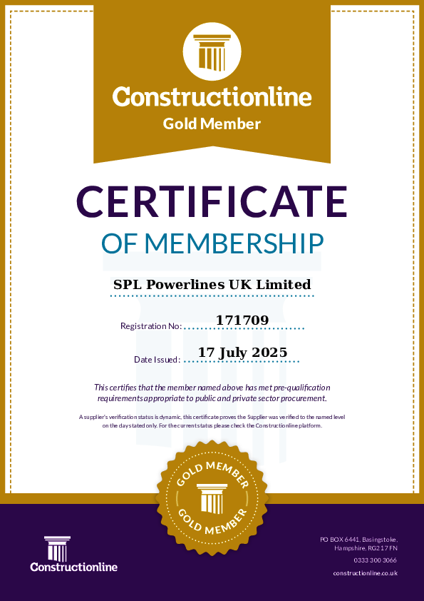 SPL Powerlines UK&I’s attainment of Constructionline Gold status marks a significant milestone in its ongoing commitment to excellence. It means SPL Powerlines UK&I has undergone a rigorous pre-qualification and verification process, going well beyond the standard PAS 91 requirements. Key areas assessed include environmental management, quality systems, equality, diversity, compliance with the Modern Slavery Act, anti-bribery / corruption policies, and strong health and safety practices (including the SSIP scheme).
